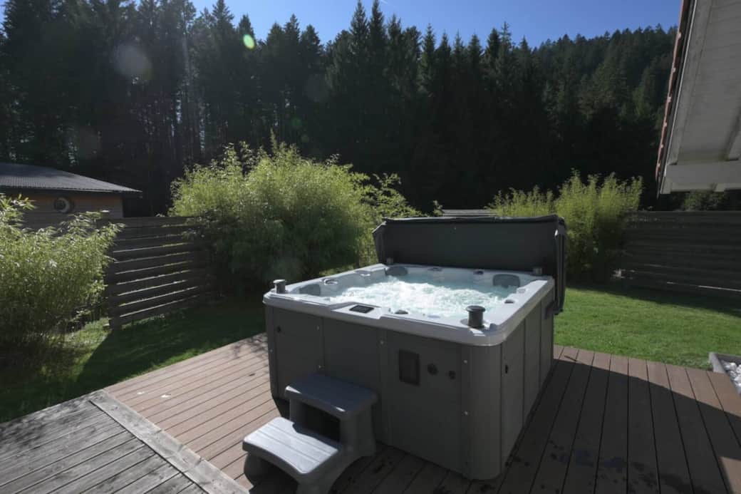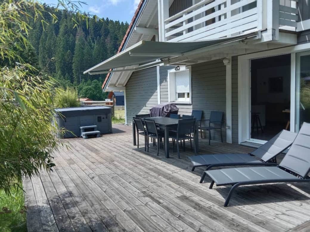 Grande terrasse avec jacuzzi privatif 24/7, plancha, et vue sur la forêt de sapins, parfait après le vélo, la randonnée ou le shopping !